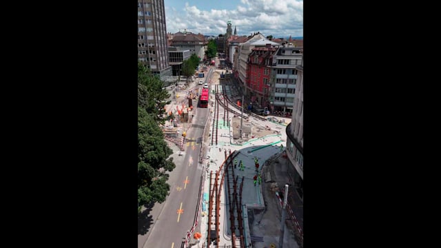 Im Laufe der letzten 1.5 Monate wurden nun weitere Meilensteine nach und nach erreicht. Dazu gehört die Fertigstellung von drei neuen Schachtbauwerken für die Kanalisation, die bis zu 5 m tief in den Untergrund reichen. Viel Aufsehen erregte bei den Passanten auch der imposante Rückbau der Tramgleise. Um die Tramgleise entfernen zu können, musste zuerst der Strassenbelag mit einer Fräse entfernt werden. Danach riss ein Abbruchbagger inkl. Spezialschaufel die einzelnen Schienen aus dem Boden. Als die alten verbogenen Schienen und restlichen Trümmer beseitigt waren, machten sich die Bauarbeitenden bereits an die Werkleitungen.